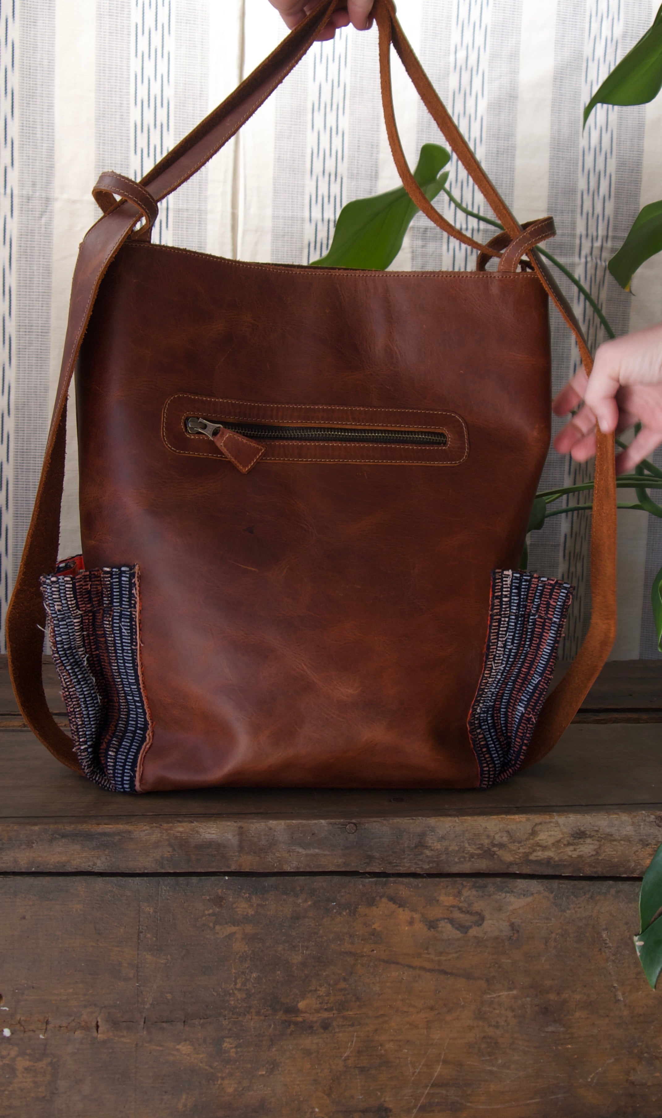 Two genuine leather side straps that convert into backpack straps