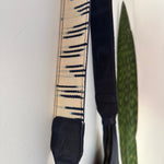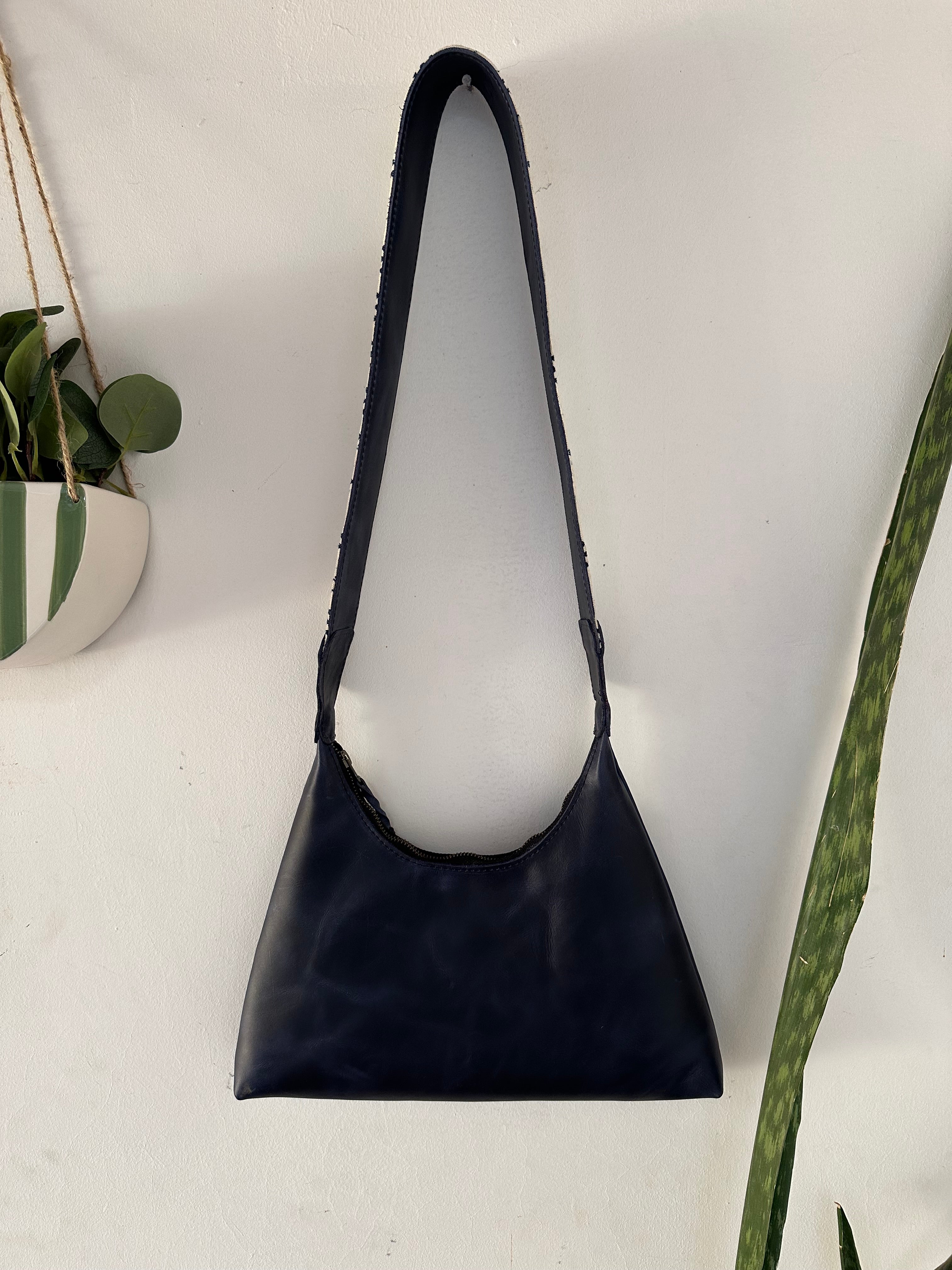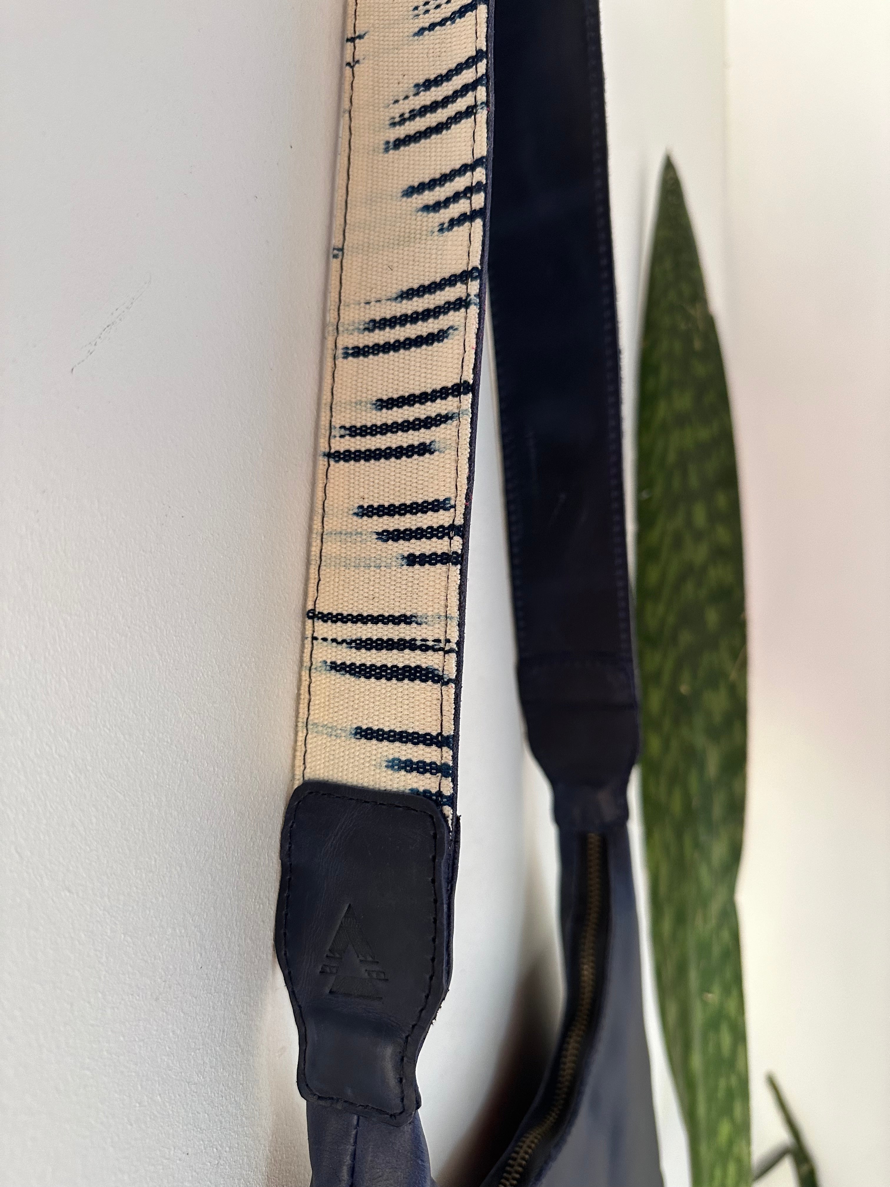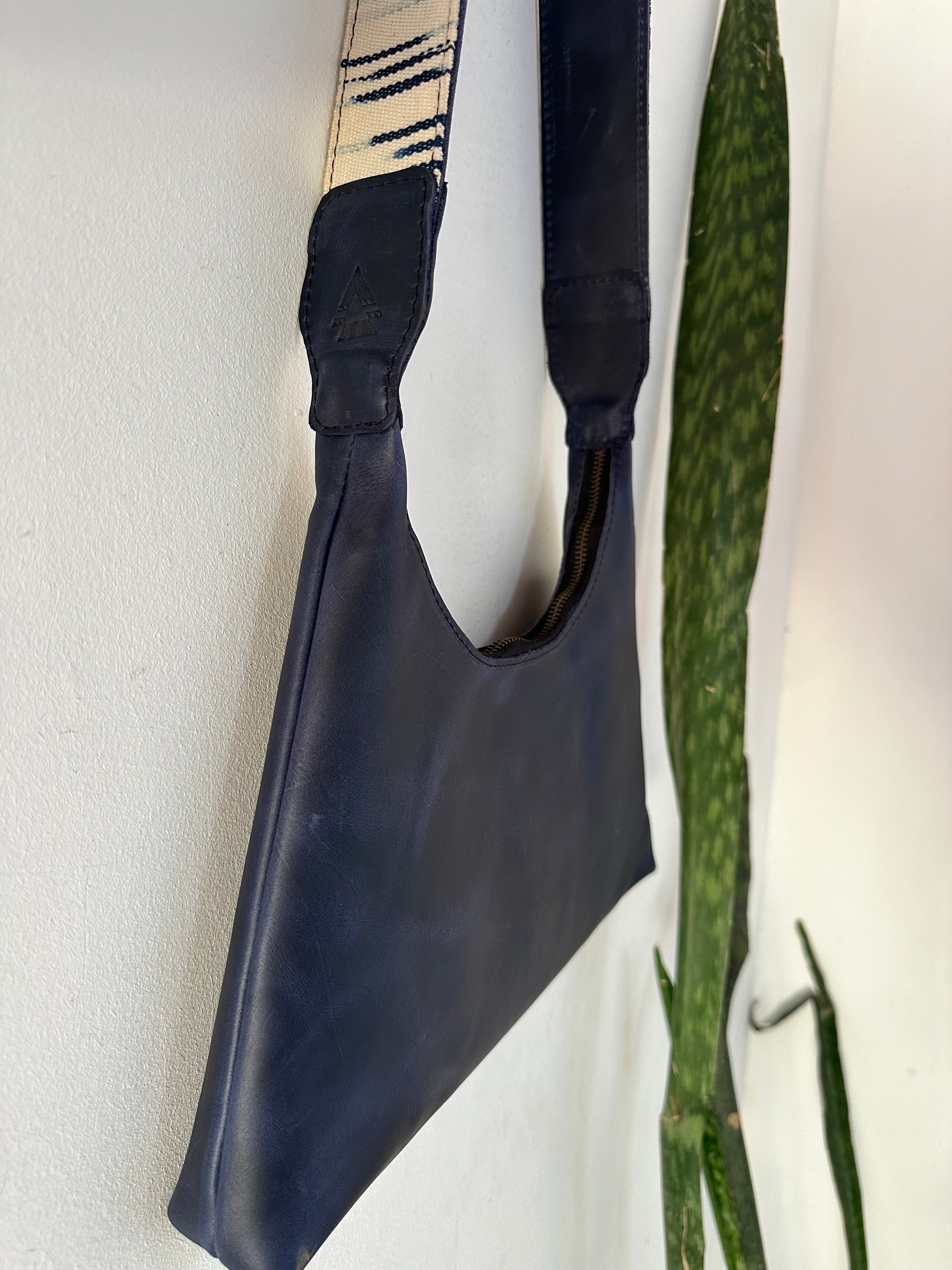 Made from full grain leather, with a 100% naturally dyed foot-loomed weaving, or hair on hide strap. This minimal bag is ideal for carrying the everyday essentials, or a night out. Lined with up-cycled, rewoven denim, from The New Denim Project. one small interior zipper pocket, and another open pocket.