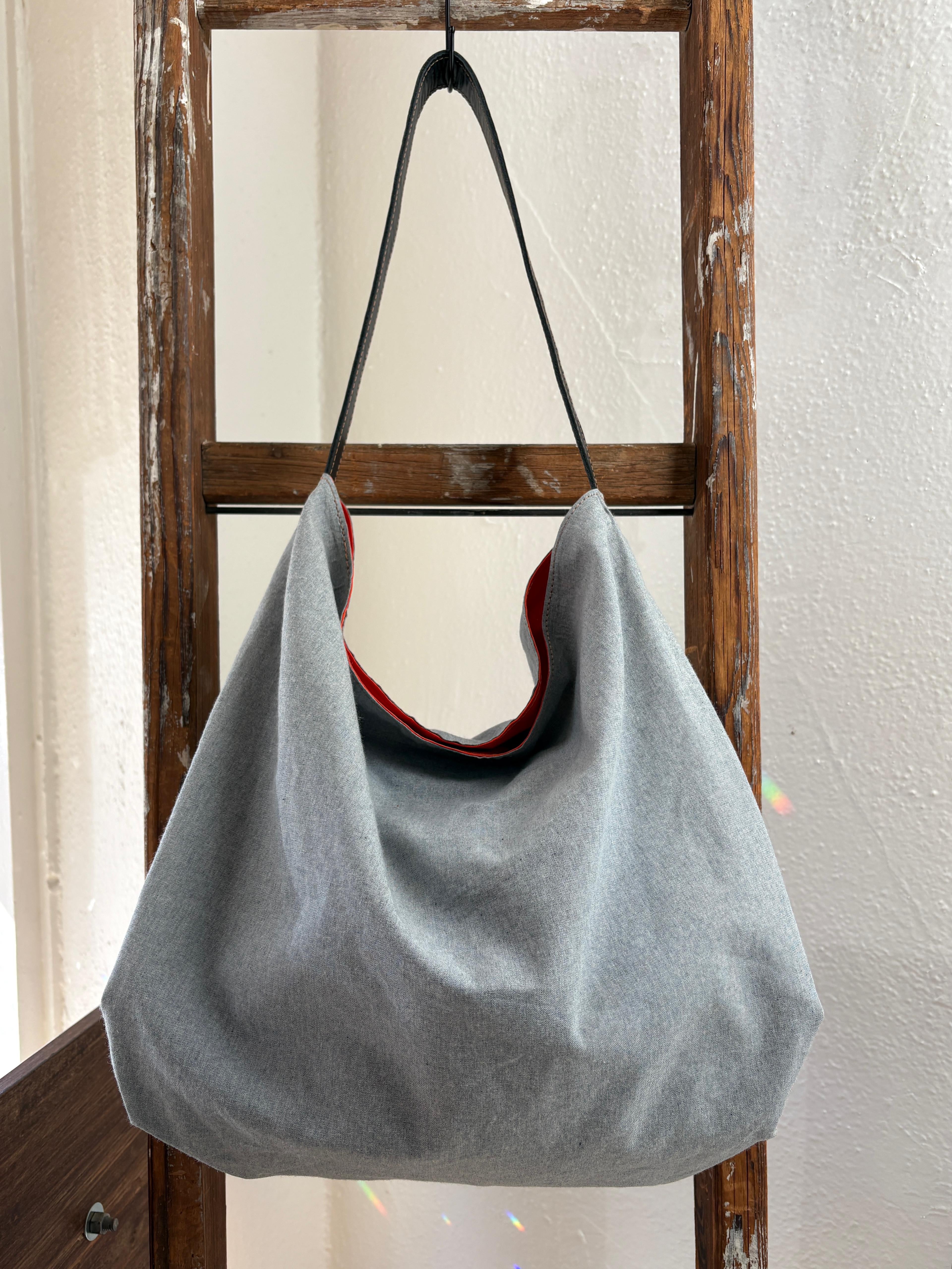 My favorite thing about our Market Totes is how nice and roomy they are, while still being super lightweight. Perfect for a day at the beach, grocery shopping, or just running around town. This tote is made from up-cycled, and rewoven denim, from our friends at The New Denim Project. With a full grain leather shoulder strap, and a hidden magnet at the top.