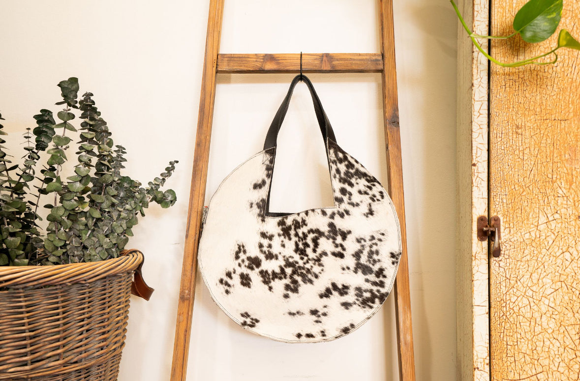 This unique hair on hide (cow hide which still has its hair), trimmed in genuine full grain leather tote is functionally stylish. The round shape is feminine and modern, yet classy. The slim width is comfortable to carry yet large enough for all your essentials plus more. With internal D rings to attach a bag strap and turn your tote into a beautiful crossbody bag.
