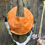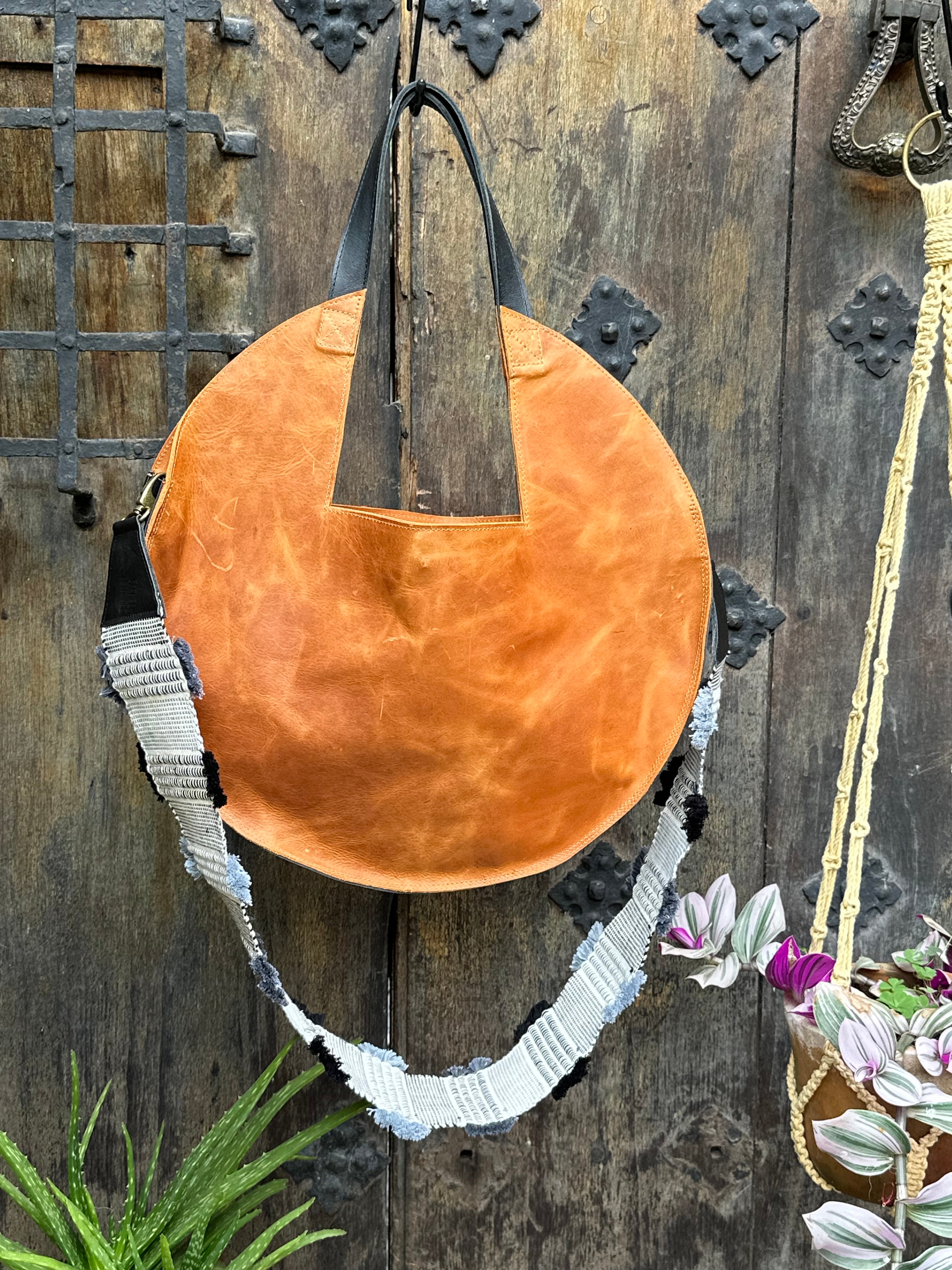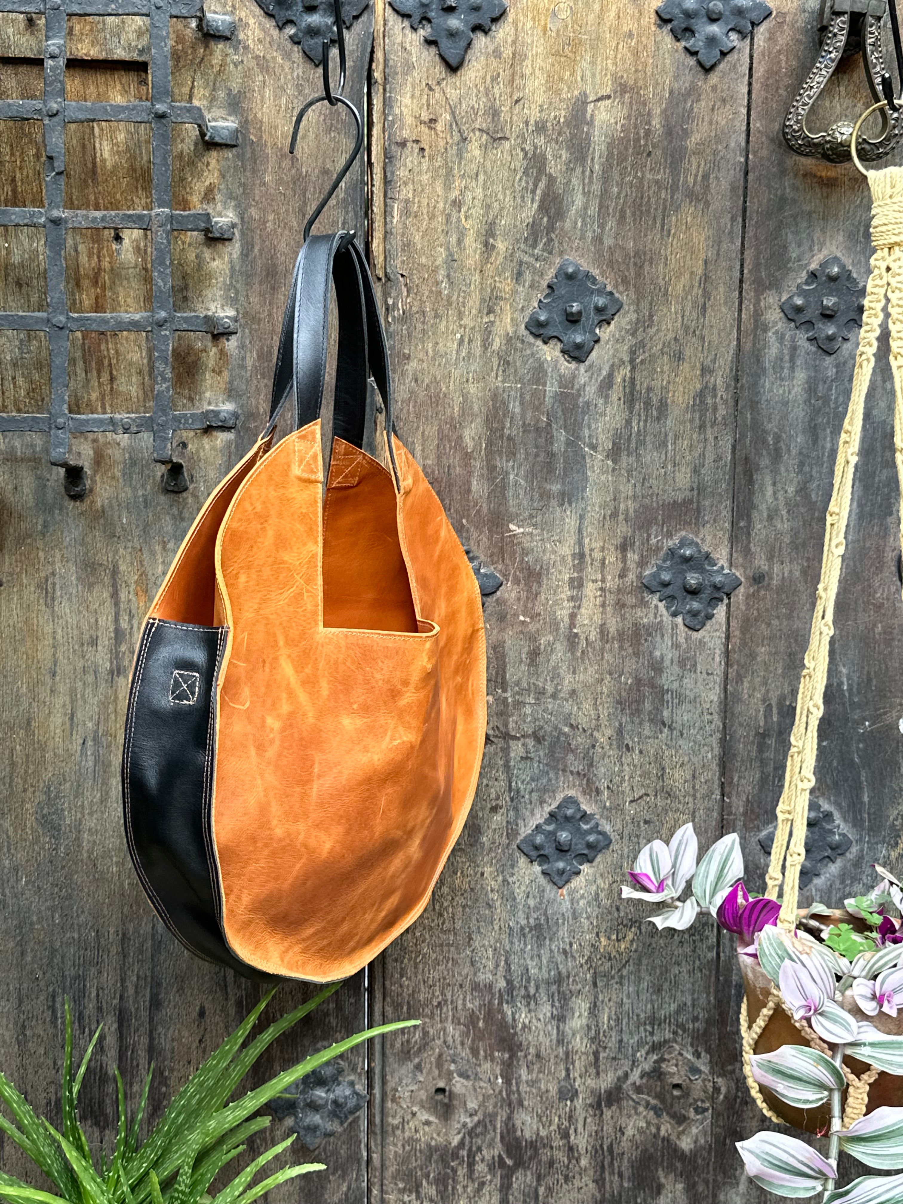 This unique genuine full grain leather tote is functionally stylish. The round shape is feminine and modern, yet classy. The slim width is comfortable to carry yet large enough for all your essentials plus more. With black leather trim and straps, internal D rings to attach a bag strap and turn your tote into a beautiful crossbody bag.