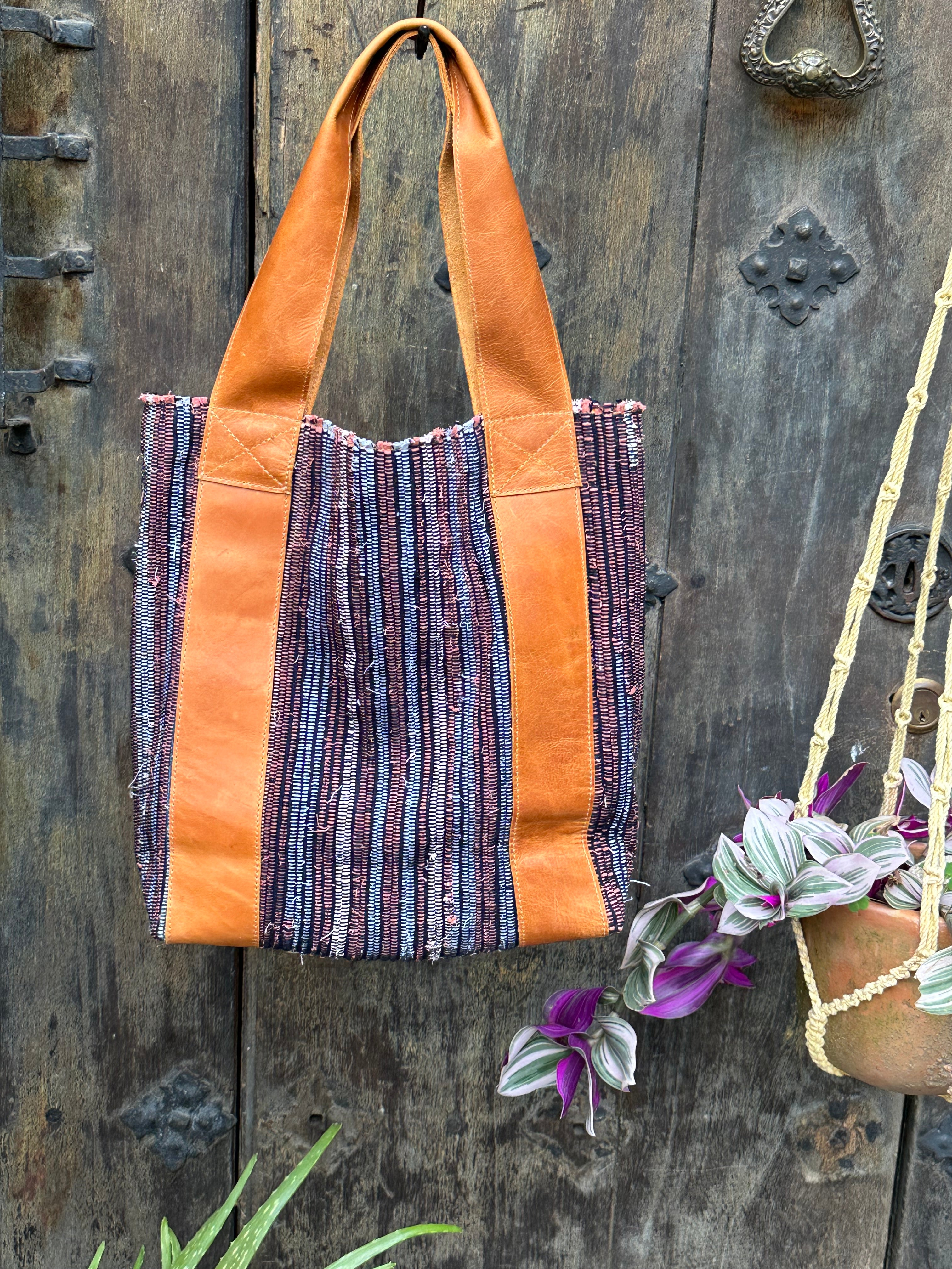 Our Wanderer Tote is truly a work of unique art made with the highest quality genuine full hide leather and a handwoven strap. These straps are made from traditional mayan belts, used to cinch the corte skirt of the typical mayan outfit, "traje".
